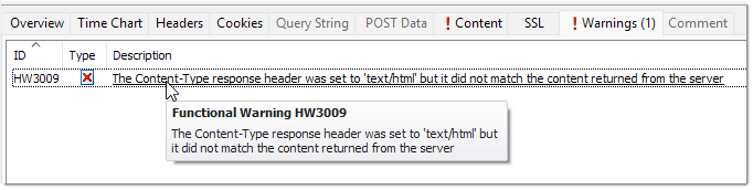 HttpWatch detects when a server returns content with an incorrect content type or header and raises warnings HW3009 and HW3010 to identify server-side misconfigurations. When HTML, JavaScript, CSS, JSON or XML is detected with the wrong MIME type, HttpWatch automatically applies the correct formatting in the Content tab.