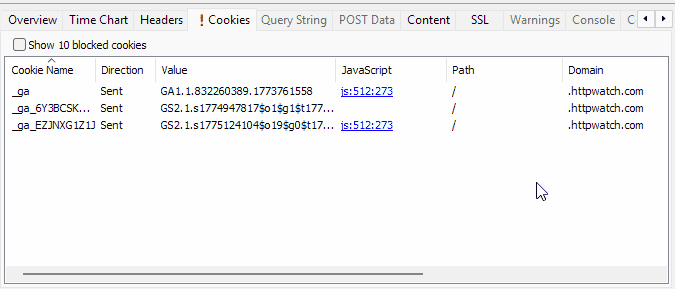 HttpWatch captures cookies assigned through JavaScript as well as cookies sent and received through HTTP headers. A JavaScript column in the Cookie tab shows the source location where each cookie was set, making it easier to diagnose authentication problems, consent issues and tracking bugs.